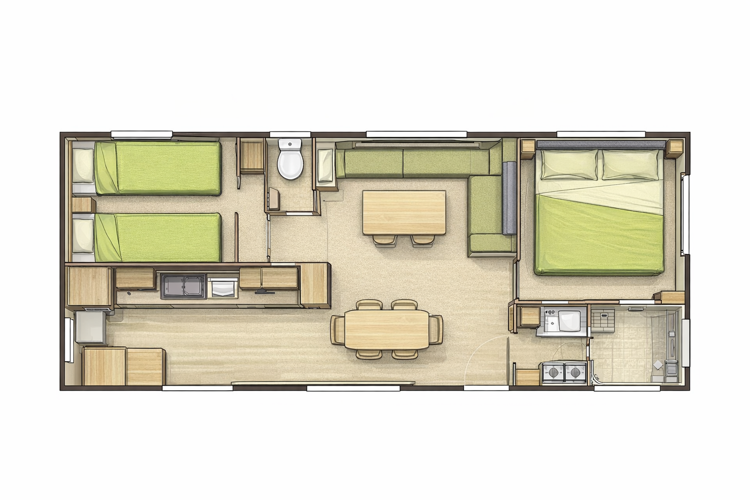 Un mobil-home confortable avec un vrai canapé convertible, un séjour spacieux et une cuisine équipée jouissant grâce aux grandes baies vitrées d’une vue imprenable sur la mer et le village de Barfleur.