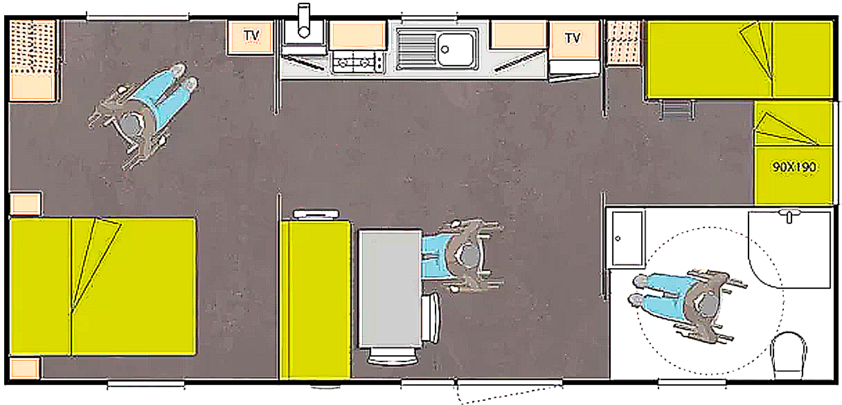 Ce mobil-home est parfaitement adapté à l’accueil des personnes à mobilité réduite ; toutes les pièces sont accessibles en fauteuil roulant, la cuisine possède un grand plan de travail et la chambre parentale spacieuse a un lit surélevé. La salle de bain est équipée d’une douche à l’italienne avec siège.