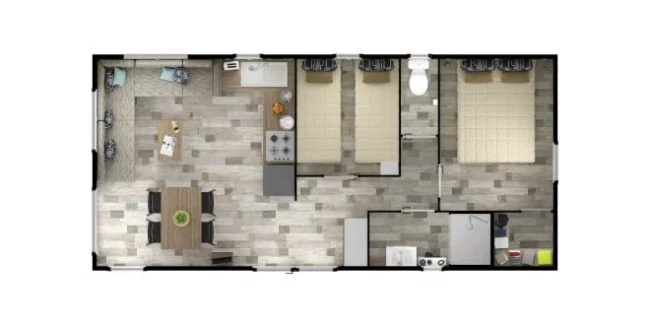 Un mobil-home confortable, un salon panoramique et une pièce de vie remarquablement grande pour un mobil-home. Grace à sa grande terrasse, vous pourrez partager vos repas et petits-déjeuners tout en contemplant la mer.