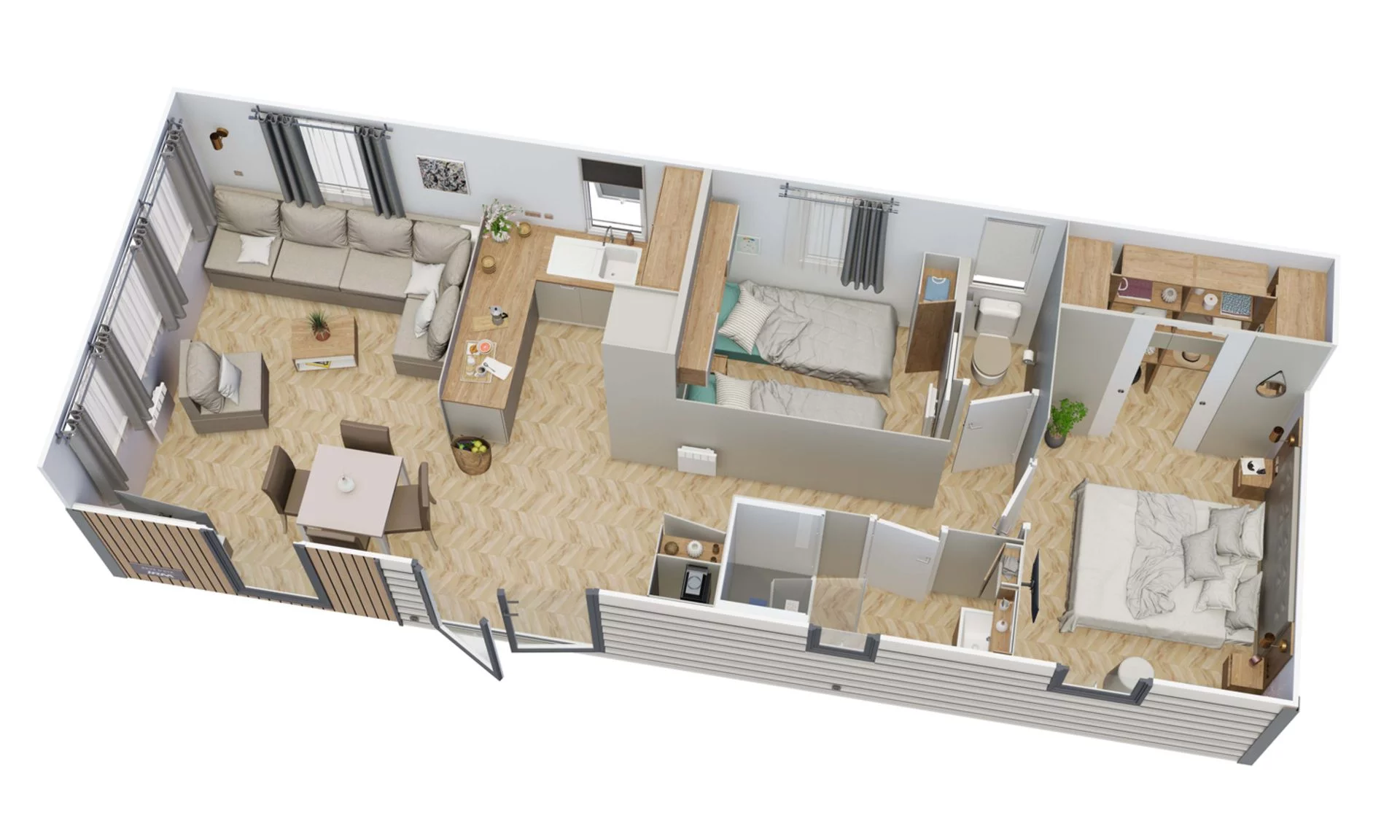 Un mobil-home spacieux, moderne et chaleureux qui enchantera vos vacances. De plus, sa grande terrasse et les fenêtres du salon offrent une vue imprenable sur la mer et le village de Barfleur aussi bien à l’intérieur qu’à l’extérieur.